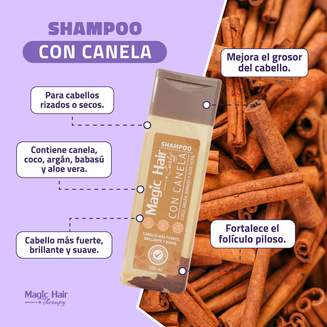 - La canela en el Shampoo Magic Hair para Rizos con Canela hidrata profundamente cada rizo, dejándolo suave.
